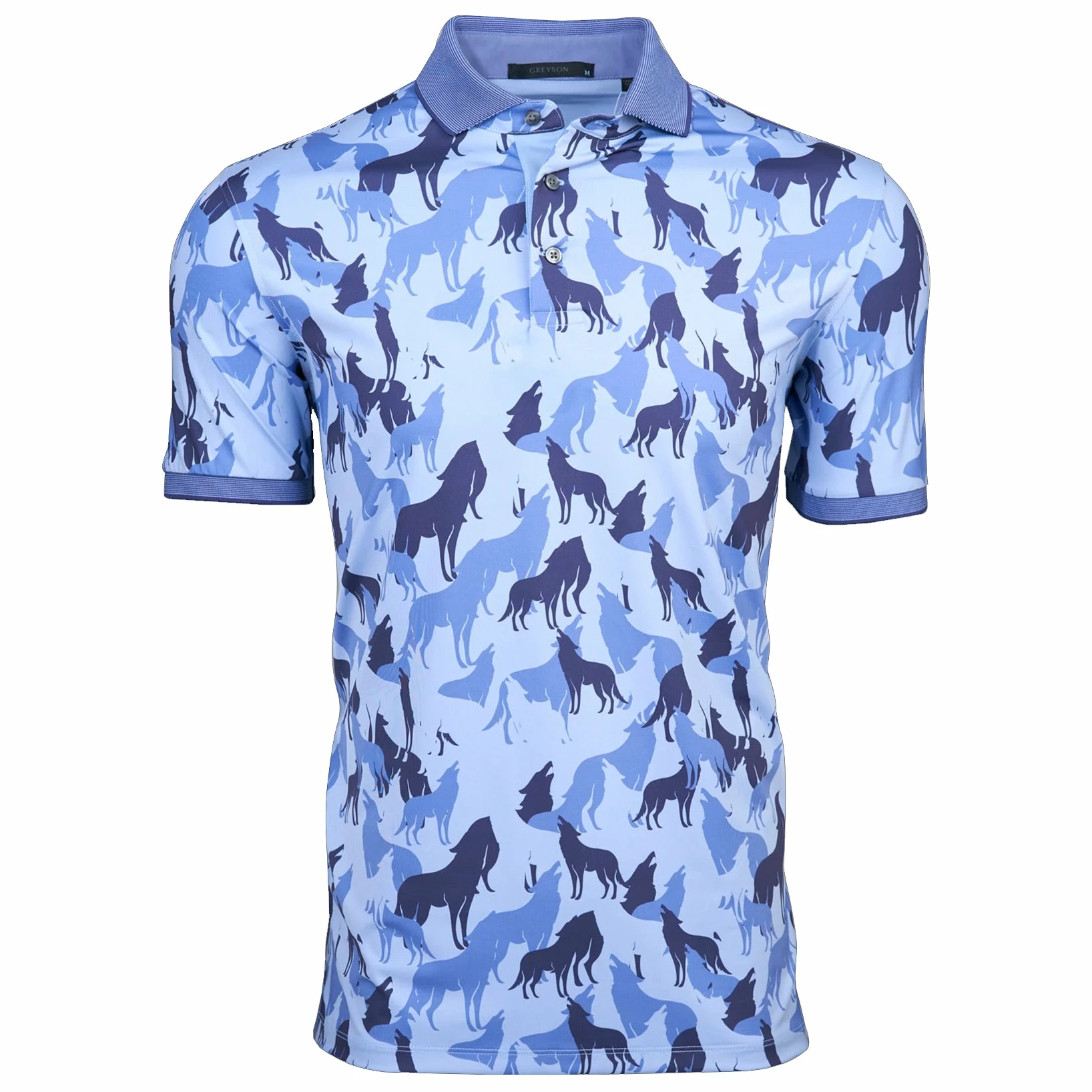 Designed to match the true strength of the wolf and its pack comes the Greyson The Shadows Golf Polo. This polo has a stylish and unique all-over print that features a sophisticated wolf pattern. The Shadows is built with a super comfortable eight-way stretch that is moisture wicking and antimicrobial to keep you dry, comfortable and smelling fresh throughout the round. The contrasting collar and all-over print will make the Shadows a stylish addition to your wardrobe.